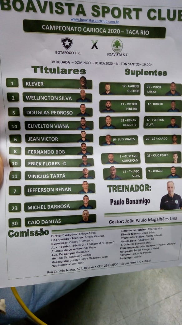 O Boavista, por sua vez, atuou no final de semana passado contra o Flamengo, pela final da Taça Guanabara. Na ocasião, o verdão de Saquarema perdeu para o rubro-negro, de virada, por 2 a 1. O técnico Paulo Bonamigo optou por botar neste domingo a mesma escalação da decisão.