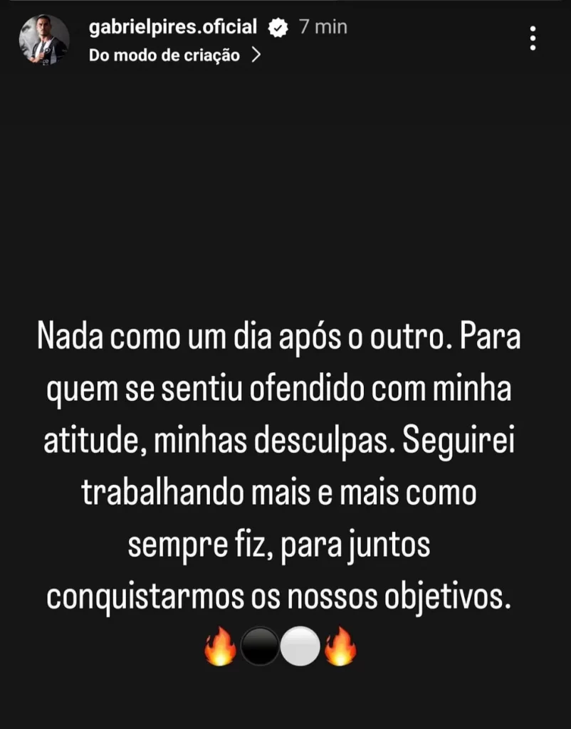 “Nada como um dia após o outro. Para quem se sentiu ofendido com minha atitude, minhas desculpas. Seguirei trabalhando mais e mais como sempre fiz para juntos conquistarmos os nossos objetivos”, disse Gabriel Pires.