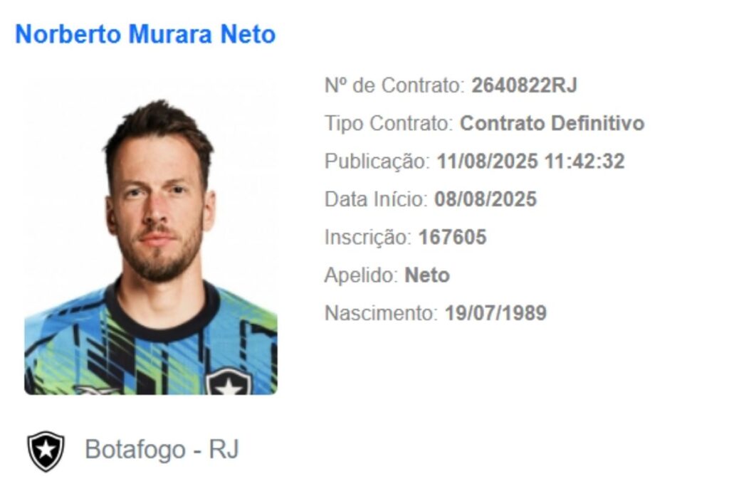 O Botafogo apresentou, na tarde desta segunda-feira (11), o goleiro Neto, reforço do clube para a sequência da temporada. O atleta de 36 anos assinou contrato até junho de 2027, podendo ampliar o vínculo por mais seis meses.