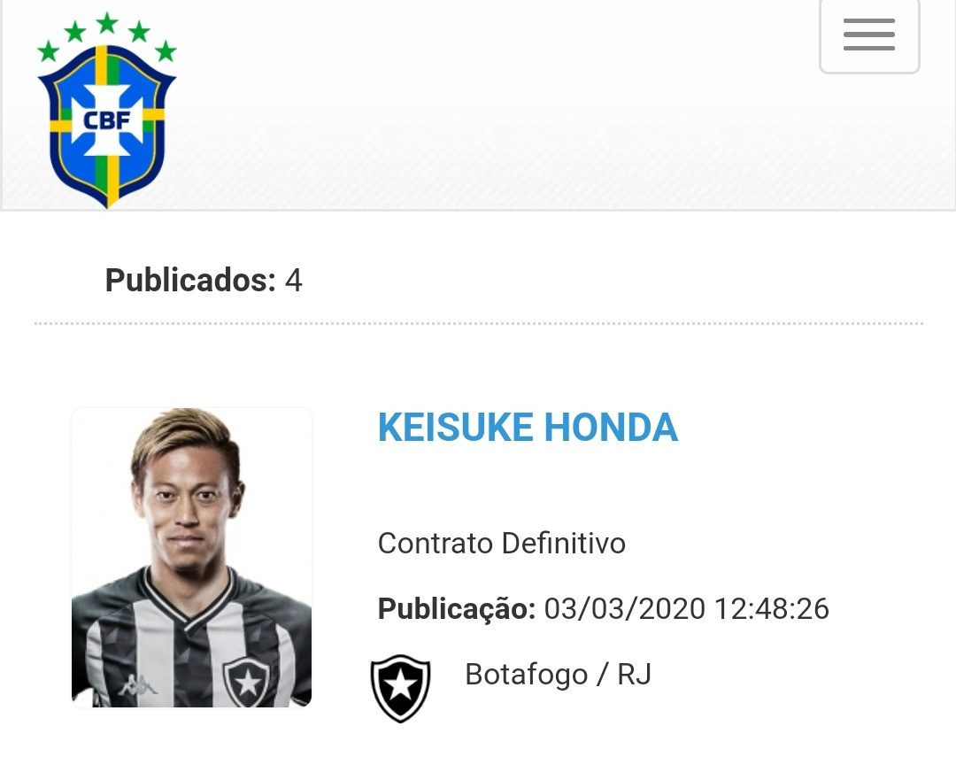 O nome de Honda apareceu no Boletim Informativo Diário da CBF (BID) e no Bira. Com isso, o meia japonês está apto para estrear pelo Botafogo. Resta ao clube definir a partida em que a principal contratação da temporada, até o momento, vai fazer a primeira partida com a camisa alvinegra.