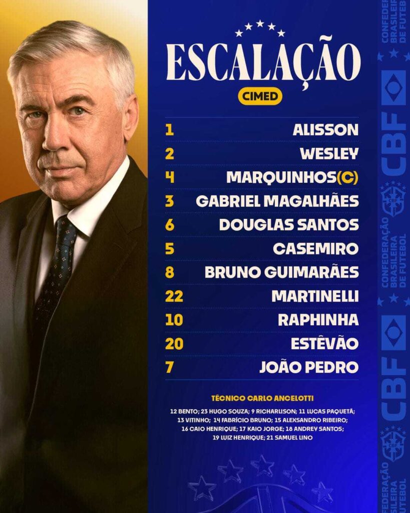 O Brasil entra em campo com Alisson, Wesley, Marquinhos, Gabriel Magalhães e Douglas Santos; Casemiro e Bruno Guimarães; Estevão, Raphinha, João Pedro e Martinelli.