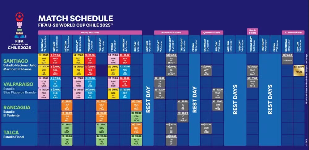 O Mundial sub-20 será disputado entre setembro e outubro de 2025 no Chile. Além de Santiago, as cidades de Valparaíso, com o Estádio Elías Figueroa Brander, Rancagua, com o Estádio El Teniente e Talca, com o Estádio Fiscal, também recebem jogos da competição.