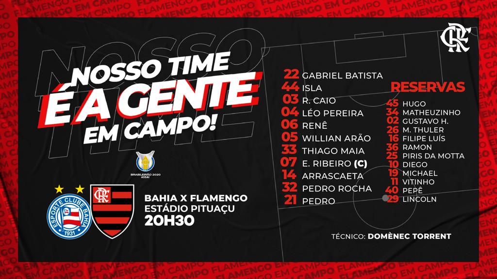 Domènec Torrent teve que mudar muito o time para o confronto. Os goleiros Diego Alves, lesionado, e César, que contraiu o coronavírus, não jogam. Com isso, o jovem Gabriel Batista vai começar. Já os atacantes Bruno Henrique, suspenso, e Gabigol, lesionado, também não vão a campo, assim como o meia Gerson. Nos lugares deles, entraram Pedro Rocha e Pedro. Michael perdeu a vaga para Everton Ribeiro.