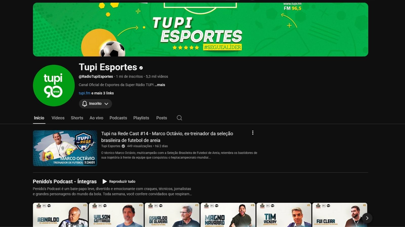O canal Tupi Esportes alcançou neste domingo (26) a marca de 1 milhão de inscritos no YouTube. O canal oficial de esportes da Super Rádio Tupi conta atualmente com 5,3 mil vídeos publicados e transmite ao vivo jogos de futebol, programas de debate e podcasts sobre o universo esportivo.
