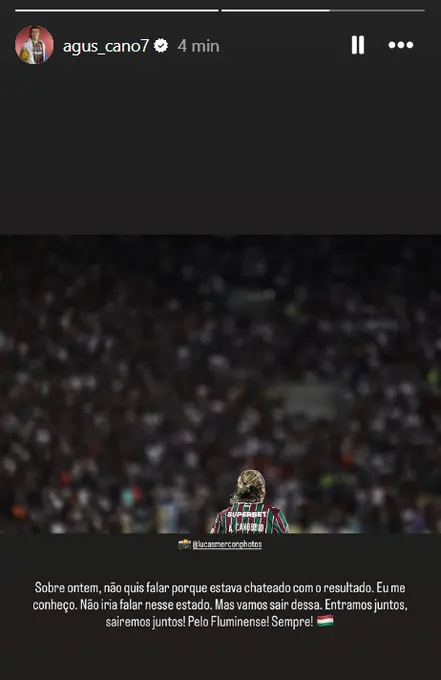 “Sobre ontem, não quis falar porque estava chateado. Não iria falar nesse estado. Mas vamos sair dessa. Entramos juntos, sairemos juntos. Pelo Fluminense. Sempre”, escreveu o jogador.