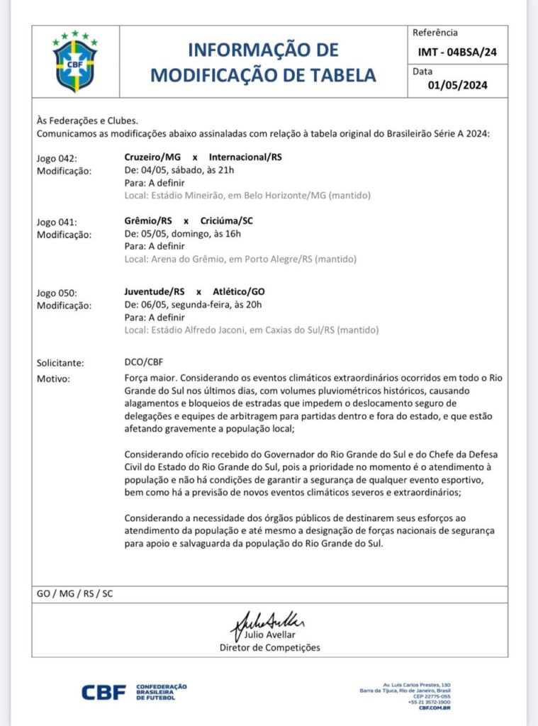 O documento da CBF explica as questões climáticas que estão impedindo os Gaúchos de levar a vida normalmente. Veja: