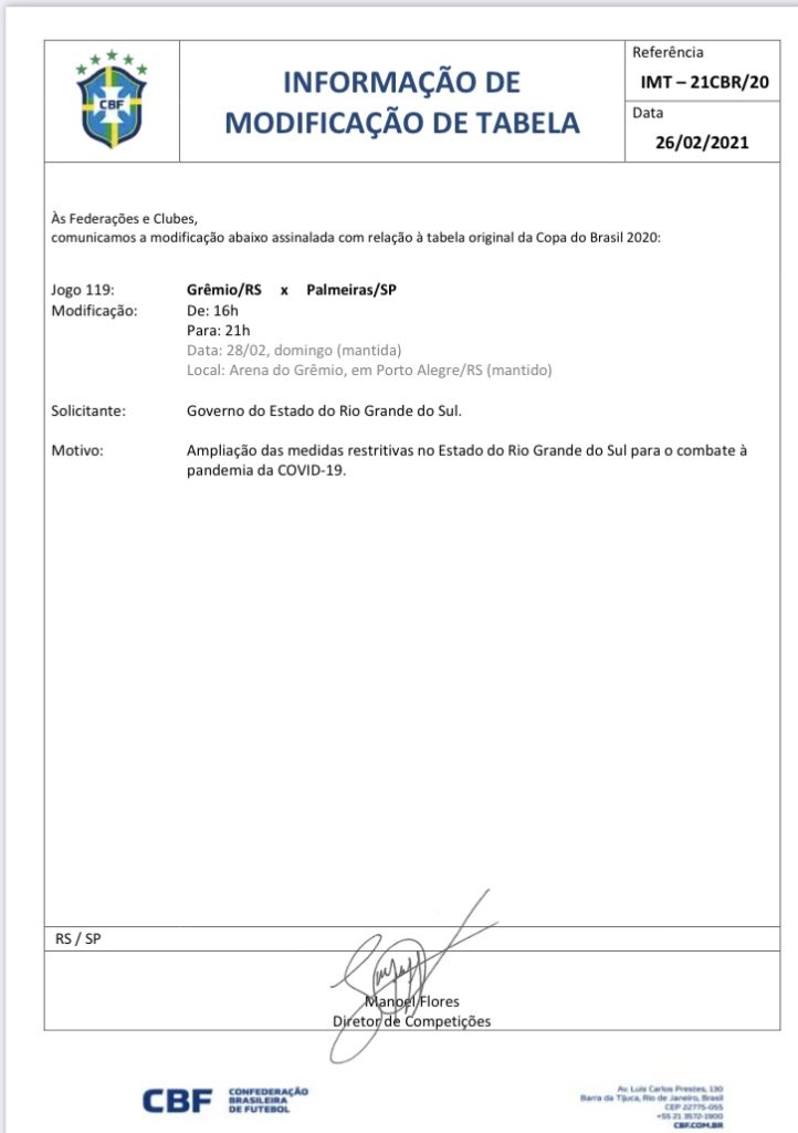 Grêmio e Palmeiras vão jogar às 21 horas em Porto Alegre devido às restrições da pandemia do COVID-19
