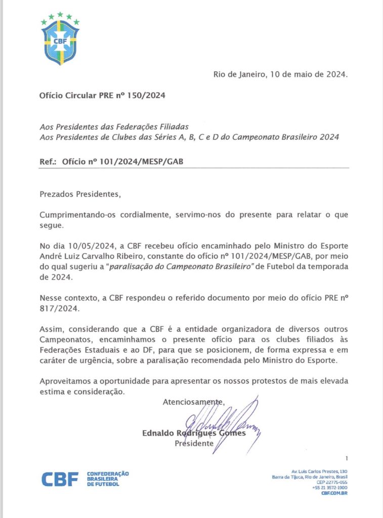A Confederação Brasileira de Futebol (CBF) divulgou um ofício, neste sábado (11), e pediu o posicionamento formal dos clubes em relação à paralisação do Brasileirão. O motivo é a continuidade do estado de calamidade pública no Rio Grande do Sul, devido às fortes chuvas. A iniciativa ocorre após a solicitação oficial do Ministério do Esporte, desejando a suspensão temporária das rodadas.