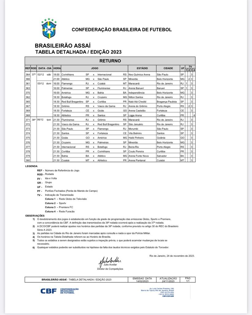 Tabela das rodadas 37 e 38 do Campeonato Brasileiro. (Foto: CBF/Divulgação)
