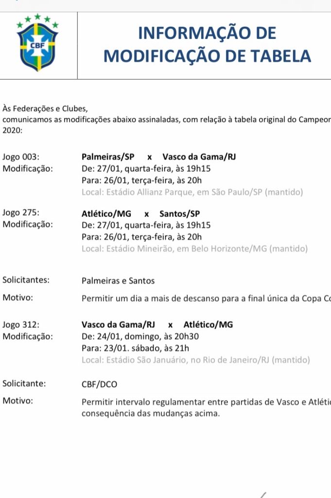 A CBF divulgou na noite desta sexta-feira (15/1), mudanças em 3 jogos da Serie A devido a final da Libertadores no Maracanã com Palmeiras x Santos, sábado, dia 30/1 às 17 horas.