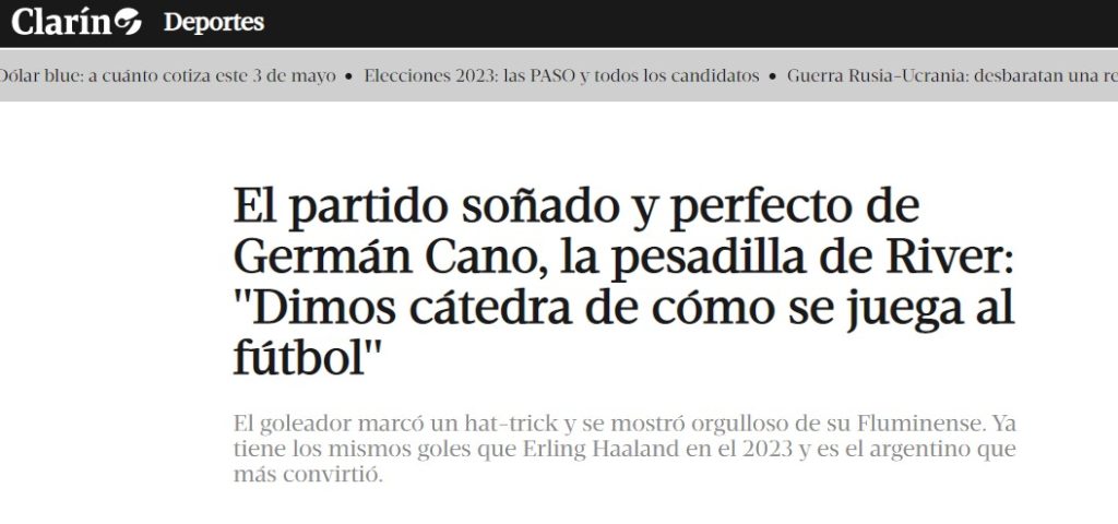 Um atropelo com show de Cano e o Fluminense consolidando ainda mais a força dentro do futebol brasileiro e sul-americano. Após a goleada diante do River Plate, nesta terça, no Maracanã, pela Libertadores a imprensa argentina destacou a atuação de Cano e o resultado conquistado pelo tricolor.