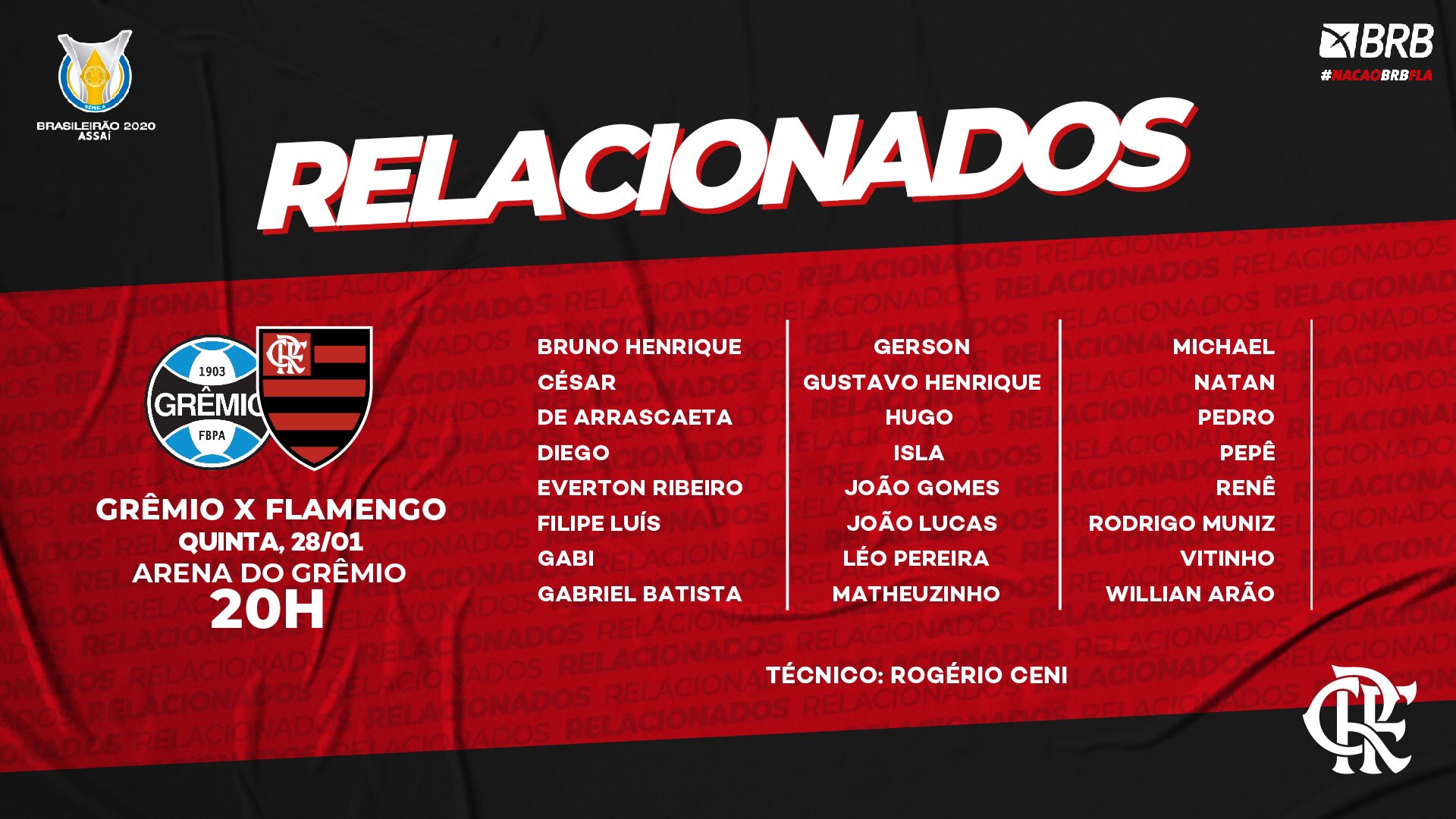 Confira a lista de relacionados do Flamengo para a partida contra o Grêmio: