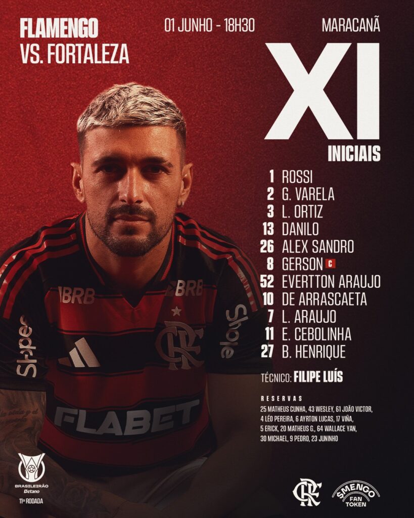 O Flamengo recebe o Fortaleza neste domingo (1), no Maracanã. Em caso de tropeço do Palmeiras, Rubro-negro ´pode assumir a liderança do campeonato. As duas equipes já estão escaladas. Confira abaixo: