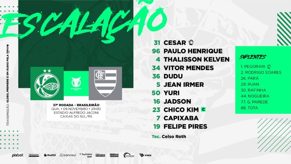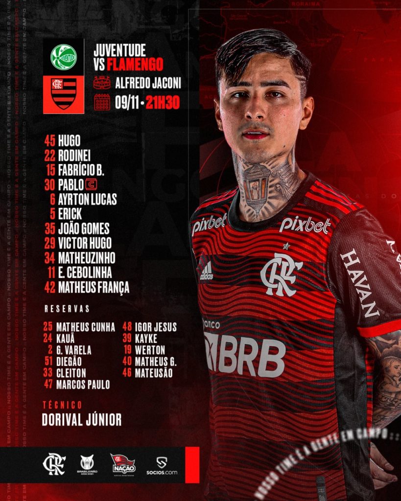 Com dois titulares, Flamengo está escalado para pegar o Juventude pelo Campeonato Brasileiro