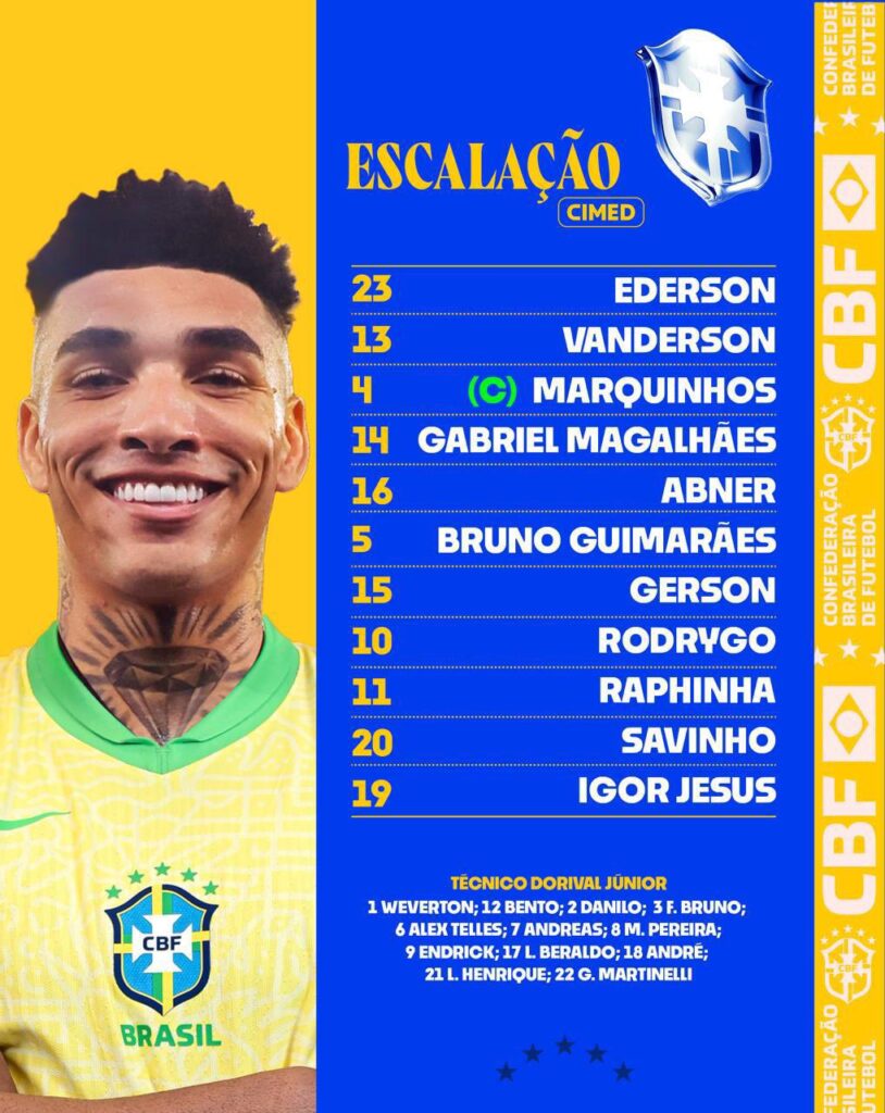 Além de Gerson, reserva contra o Chile, Vanderson e Bruno Guimarães começam jogando. Dorival Júnior mudou o meio-campo que não foi bem nos últimos jogos e Danilo também vai pro banco depois de falhar no gol de Vargas.