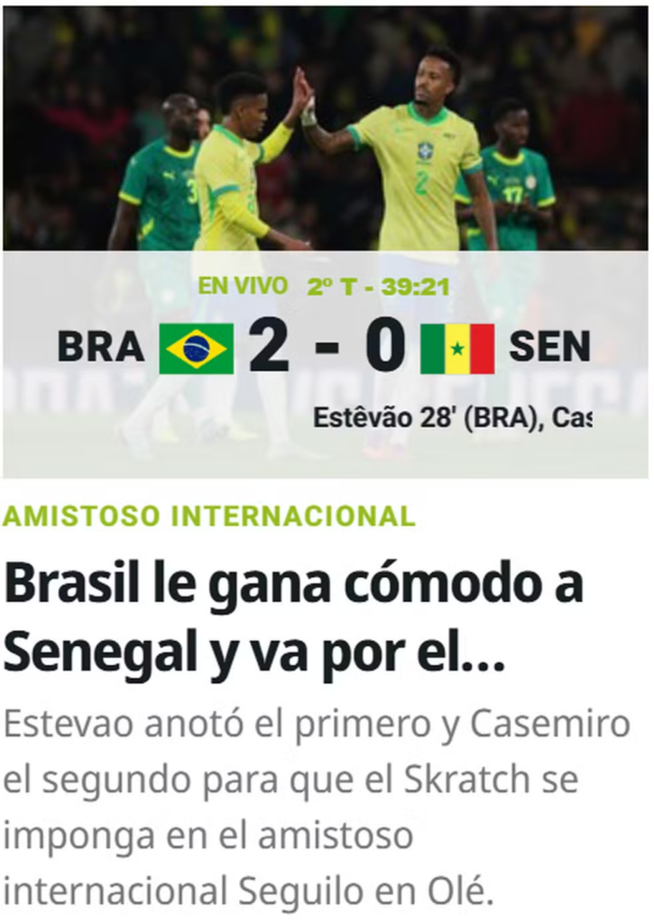 O olé, da Argentina, destacou a tranquilidade do Brasil em obter os dois gols ainda no primeiro tempo, e, consequentemente, ficar com o resultado positivo, mesmo diminuindo o ritmo durante a etapa final.
