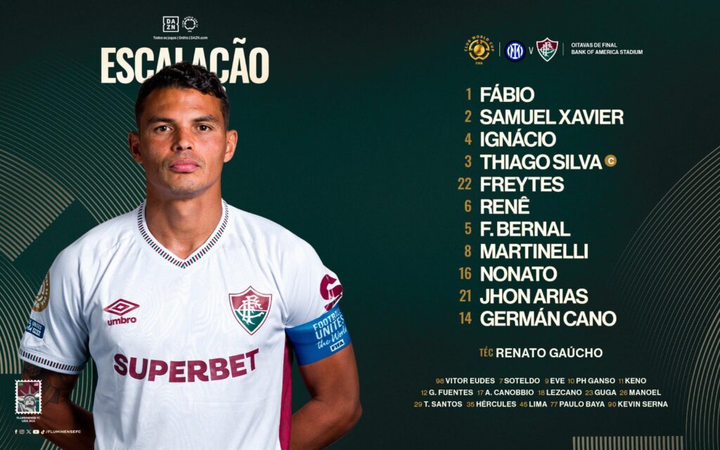 Nesta segunda-feira (30), o Fluminense enfrenta a Inter de Milão às 16h, no Bank of America Stadium, pelas oitavas de final da Copa do Mundo de Clubes. O treinador Renato Gaúcho optou por uma formação com três zagueiros, com os retornos de Thiago Silva e Bernal entraram nas vagas de Hércules e Canobbio.