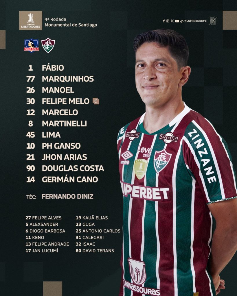 O Fluminense está definido para a quarta rodada do Grupo A da Libertadores, diante do Colo-Colo, do Chile, às 21h, de Brasília, no Monumental de Santiago. O técnico Fernando Diniz opta por manter Marquinhos na lateral direita, já que Samuel Xavier segue fora por lesão. Assim, Douglas Costa segue no ataque ao lado de Jhon Arias e Cano.