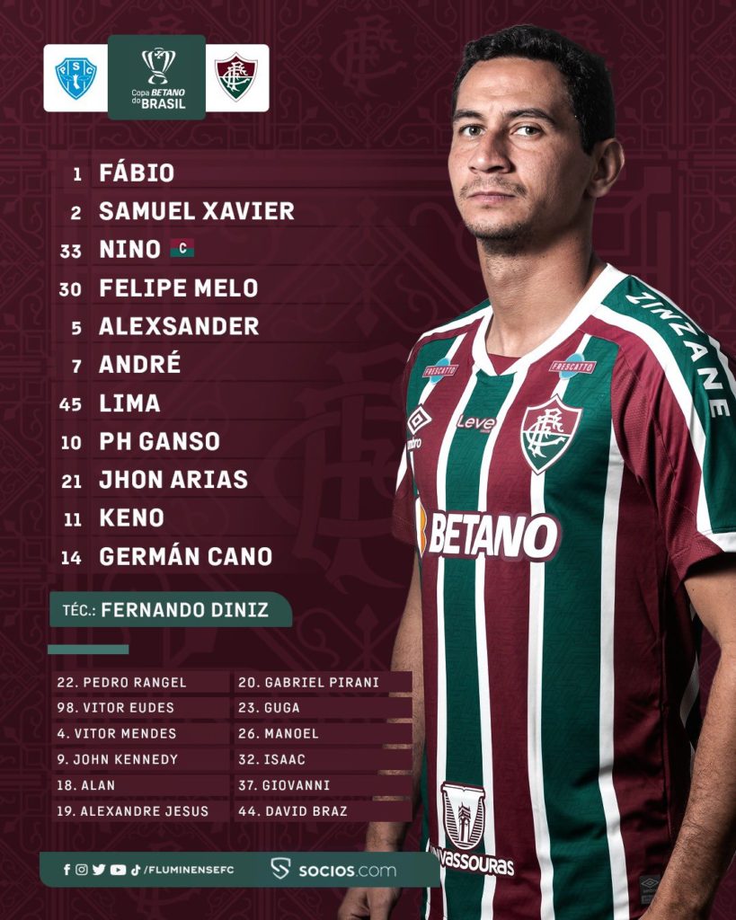Mesmo com a vantagem do jogo de ida – venceu por 3 a 0 no Maracanã -, o técnico Fernando Diniz escalou força máxima para enfrentar o Paysandu pelo jogo de volta da terceira fase da Copa do Brasil. A única ausência é do lateral-esquerdo Marcelo, poupado depois de sentir dores na panturrilha na partida contra o The Strongest pela Libertadores.