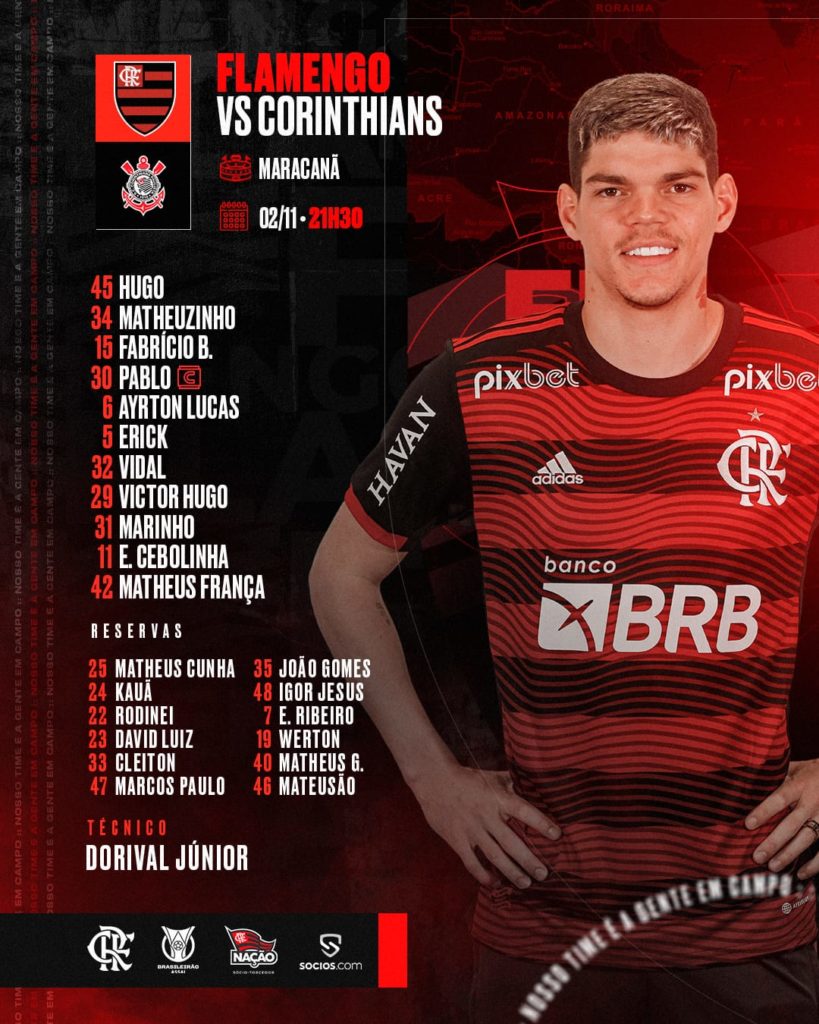 Com Hugo Souza no gol, Flamengo está escalado para pegar o Corinthians pelo Brasileiro