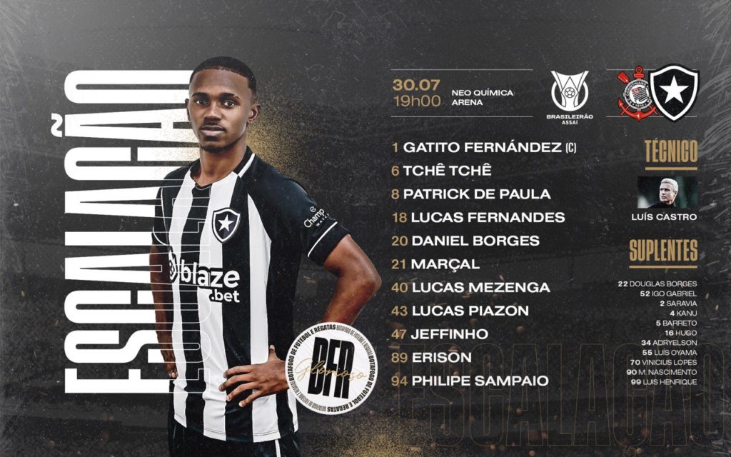 Com Jeffinho e Erison, Botafogo está escalado para pegar o Corinthians pelo Brasileiro