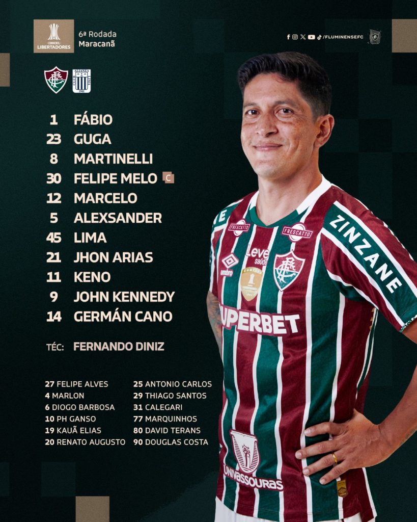O Fluminense está escalado para enfrentar o Alianza Lima pela 6ª rodada da fase de grupos da Libertadores. Com John Kennedy titular e Martinelli de zagueiro, Fernando Diniz deixou Ganso no banco de reservas.