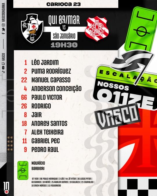 O Vasco confirmo a escalação para a partida diante do Bangu, nesta quinta-feira, às 19h30, em São Januário. O técnico Maurício Barbieri colocou o zagueiro Léo e o lateral-esquerdo Lucas Piton no banco de reservas. A Super Rádio Tupi transmite com narração de José Carlos Araújo e comentários de Dé Aranha.