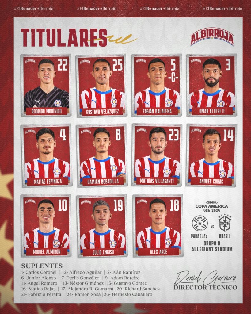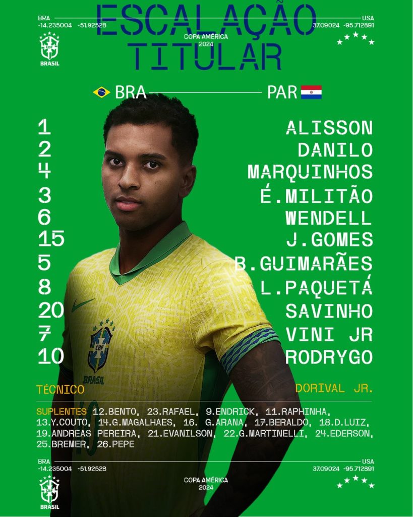 Nesta sexta-feira (28), o Brasil enfrenta o Paraguai pela segunda rodada da Copa América, em Las Vegas, às 22h. A seleção brasileira de Dorival Júnior terá duas mudanças no time titular. O atacante Savinho entra no lugar de Raphinha, e Wendell substitui Guilherme Arana.