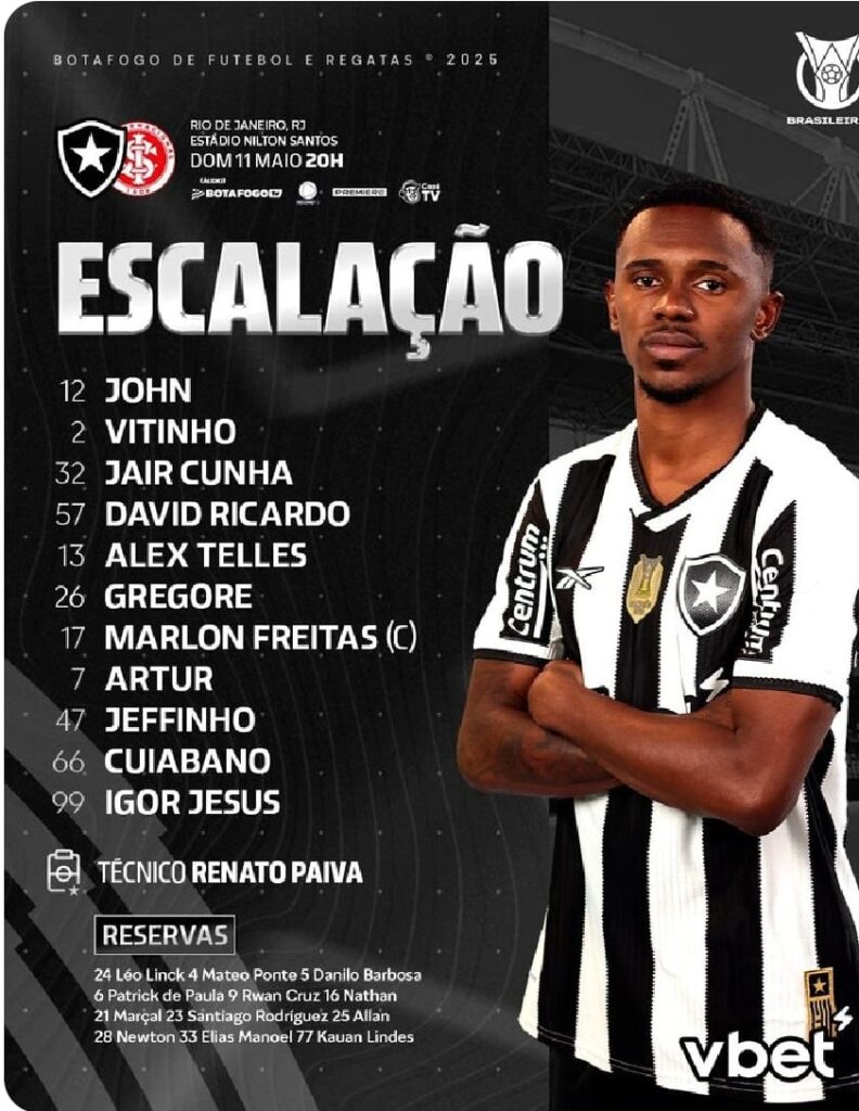 Com novidade na frente, Botafogo está escalado para encarar o Internacional pelo Brasileirão