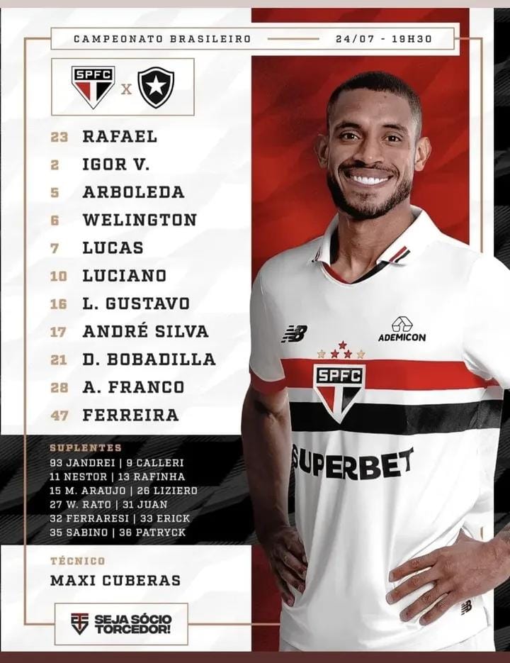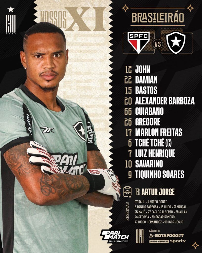 O Botafogo está pronto para enfrentar o São Paulo, daqui a pouco, às 19h30, no Morumbis, pelo Campeonato Brasileiro. Sem Júnior Santos, com fratura na tíbia, o técnico Artur Jorge optou pela entrada de Tchê Tchê no setor de meio, reforçando a marcação. Quem também volta a ser titular é o atacante Tiquinho Soares.