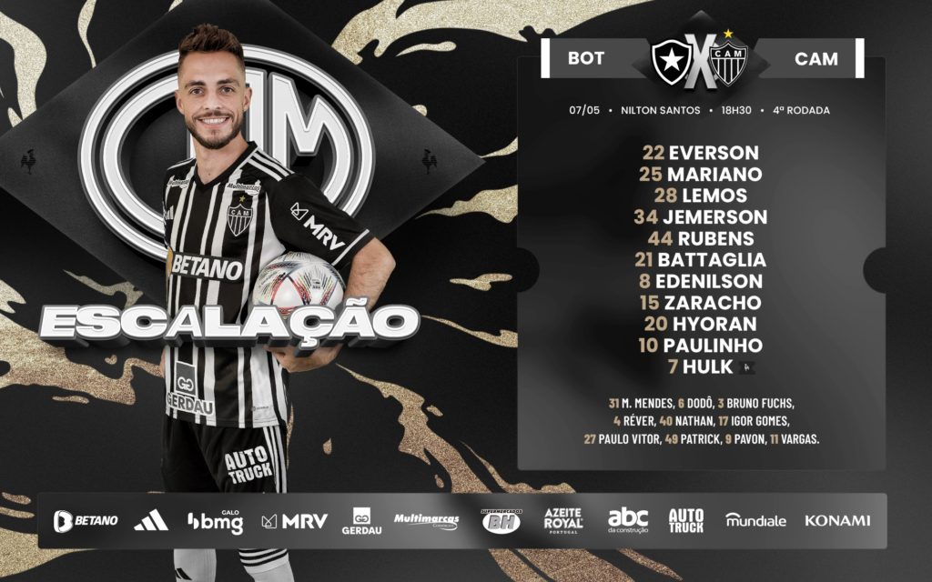 O Botafogo está escalado para enfrentar o Atlético-MG, daqui a pouco, às 18h30, pela quarta rodada do Campeonato Brasileiro. Matheus Nascimento, Gabriel Pires e Hugo são as principais novidades na equipe titular. Tiquinho, Tchê Tchê e Marçal, poupados, ficam no banco.