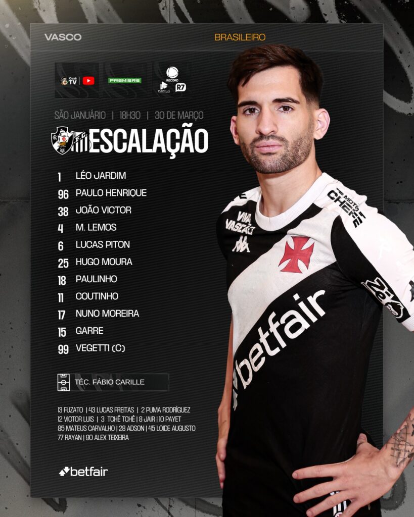 Neste domingo (30), o Vasco enfrenta o Santos às 18h30, em São Januário, pela primeira rodada do Brasileirão Série A. O técnico Fábio Carille escalou Maurício Lemos e Garré nos lugares de Lucas Freitas e Rayan.