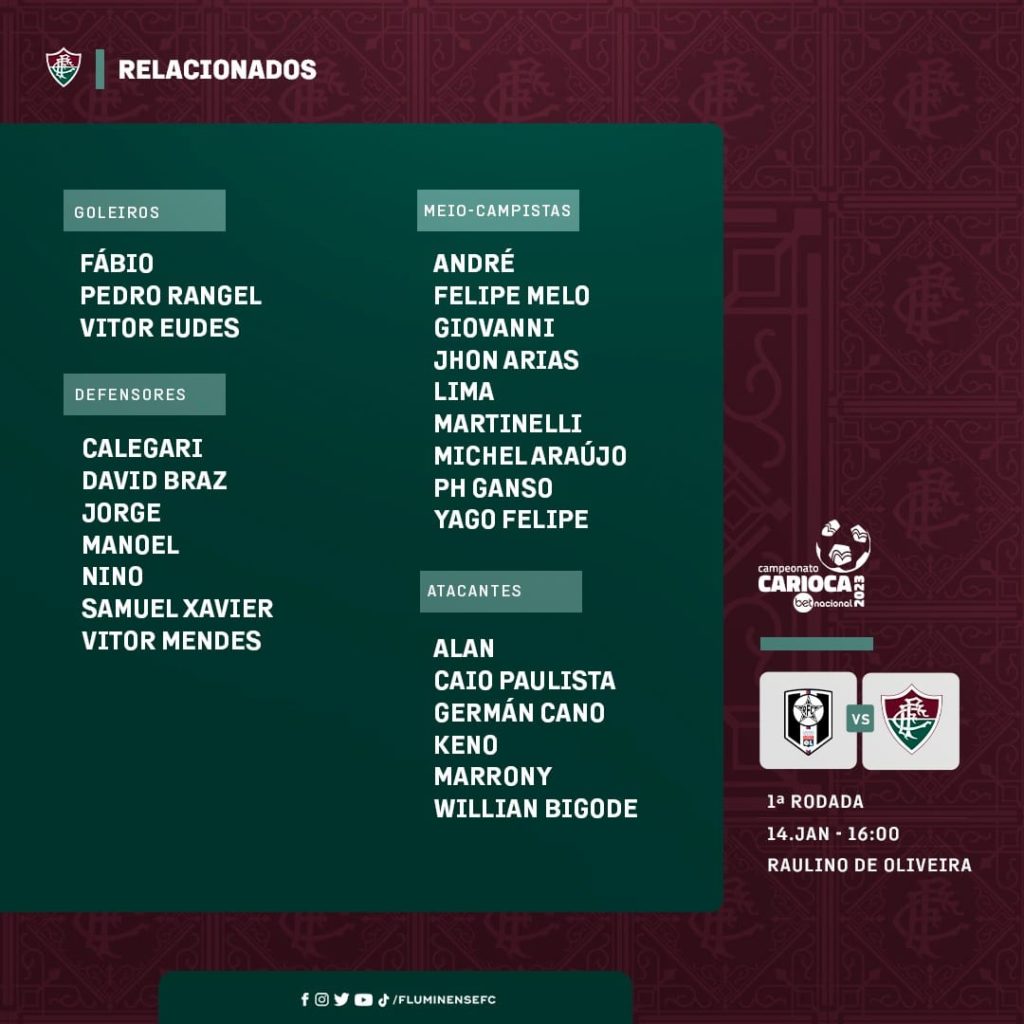 O Fluminense divulgou a lista de relacionados para a primeira partida do clube na temporada. Com o elenco principal à disposição do técnico Fernando Diniz, dos reforços contratados pelo tricolor, apenas o lateral direito Guga está fora. A estreia no Campeonato Carioca acontece neste sábado, às 16h, contra o Resende, no Raulino de Oliveira, na cidade de Volta Redonda.