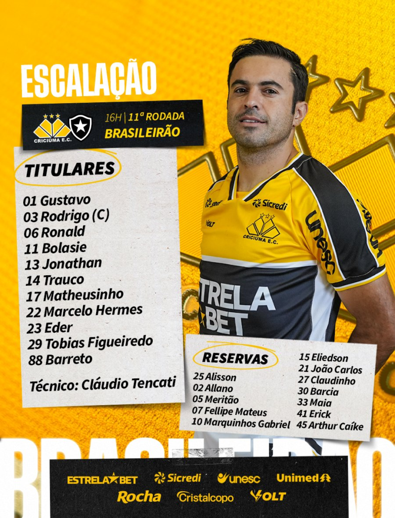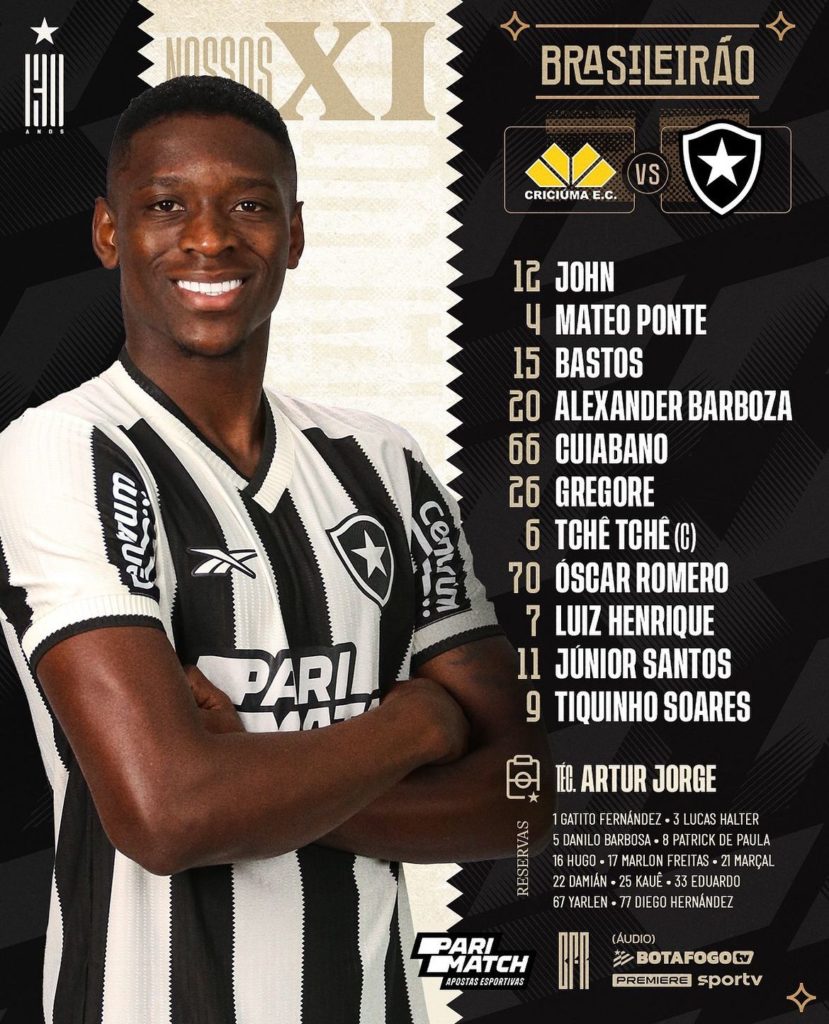 O Botafogo vai até o Heriberto Hulse enfrentar o Criciúma pela 11ª rodada do Campeonato Brasileiro, neste sábado (22), às 16h. A equipe de Artur Jorge vai com tudo em busca da liderança da competição. As novidades em relação ao último jogo ficam por conta das entradas de Mateo Ponte, Barboza, Gregore, Luiz Henrique e Tiquinho Soares no time titular.