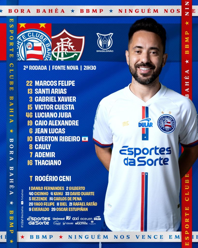O Bahia está definido, tendo Marcos Felipe; Santiago Arias, Gabriel Xavier, Victor Cuesta, Luciano Juba; Caio Alexandre, Jean Lucas, Everton Ribeiro; Cauly, Ademir, Thaciano.