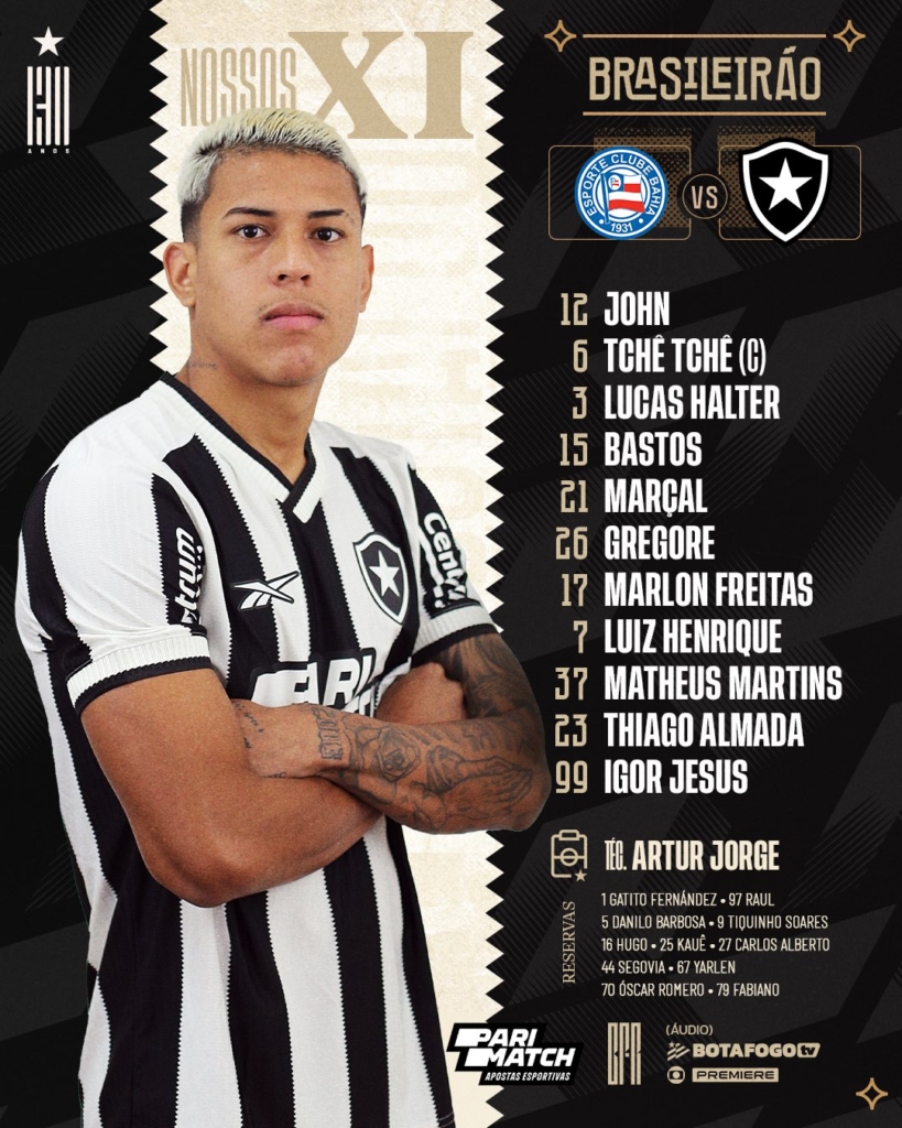 Com Tchê Tchê na lateral, Botafogo está escalado para enfrentar o Bahia pelo Brasileiro