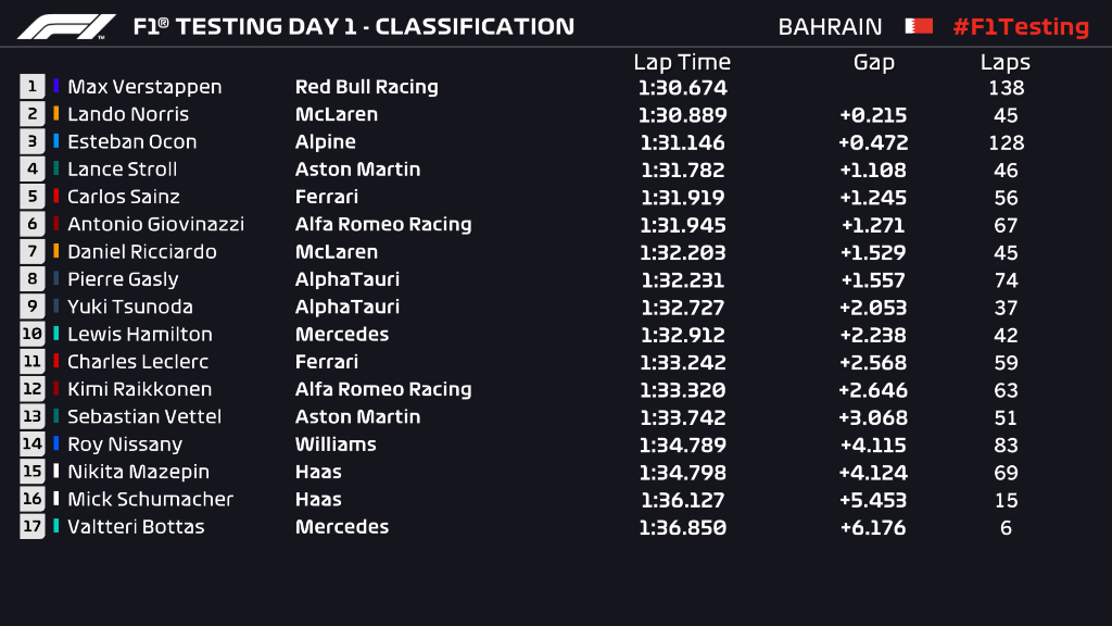Os carros da Mercedes, de Hamilton e Bottas, penaram com questões de confiabilidade e não conseguiram registrar bons tempos. A atividade também serviu para os pilotos sentirem melhor o rendimento dos compostos da Pirelli que serão usados durante a temporada de 2021. Abaixo, confira os tempos registrados no treino da tarde: