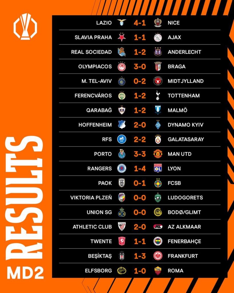 Dentre os principais resultados, Porto e Manchester United ficaram no empate em 3 a 3, com gol e assistência do brasileiro Pepê, o Lyon goleou o Rangers por 4 a 1, o Tottenham bateu o Ferencvaros por 2 a 1 e a Roma foi protagonista de uma zebra na derrota para o Elfsborg por 1 a 0.