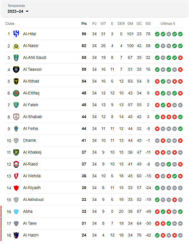 Um dos mais badalados da temporada 2023/24, o Campeonato Saudita foi encerrado nesta segunda-feira (27). Com as principais posições já definidas na parte de cima da tabela, o jogo de maior destaque foi entre Al Akhdoud e Al Taee, que, em confronto direto, brigavam pela última vaga fora do Z-3.