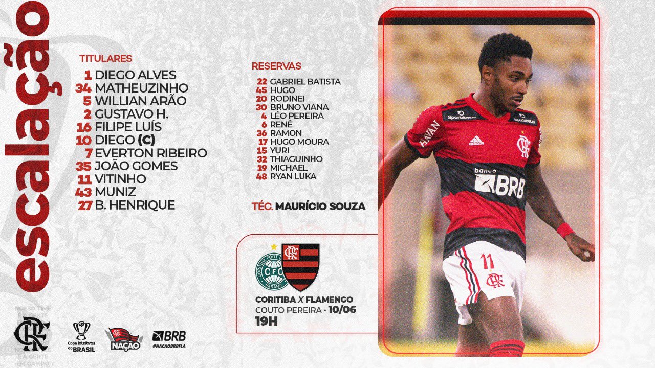 No time que começa jogando, a presença de jogadores mais novos como Matheuzinho, na lateral direita, e Rodrigo Muniz no ataque. Isla está com a seleção chilena e Rodinei fica no banco. Já no setor ofensivo, Pedro foi preservado pela viagem recente com a seleção olímpica e Gabigol não se apresentou em Curitiba, inclusive com chances de punição. Confira a escalação: