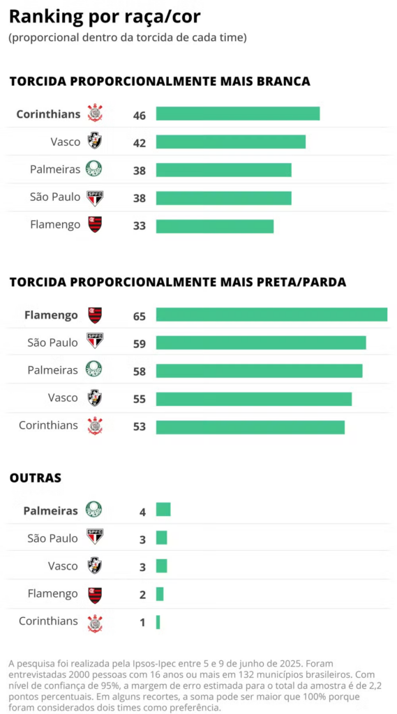 Entre os clubes analisados, o Corinthians e o Vasco possuem a maior proporção de torcedores brancos, com 46% e 42%, respectivamente. Em contrapartida, o Palmeiras tem 38% de sua base de torcedores identificada como branca. Já entre as raças e etnias diversas, as diferenças são sutis. O Palmeiras é o clube que apresenta a maior diversidade com uma pequena proporção de outras classificações raciais, confirmando a complexidade desta questão no panorama brasileiro das torcidas.
