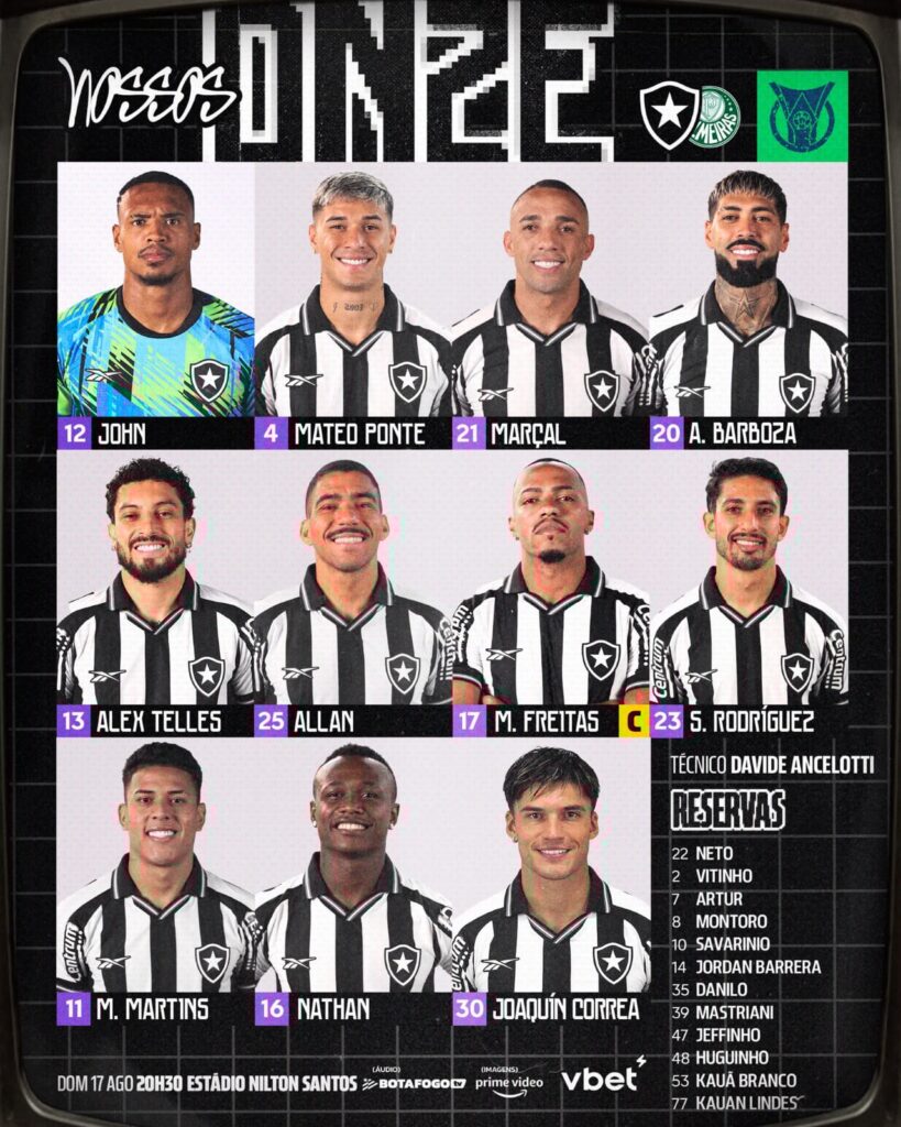 Confira as escalações de Botafogo x Palmeiras ao vivo