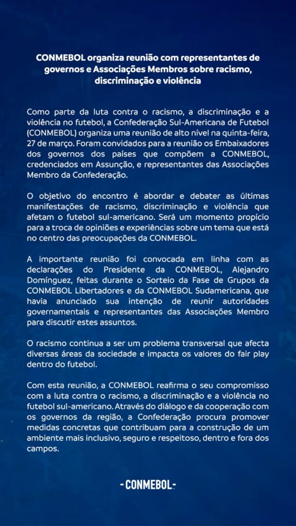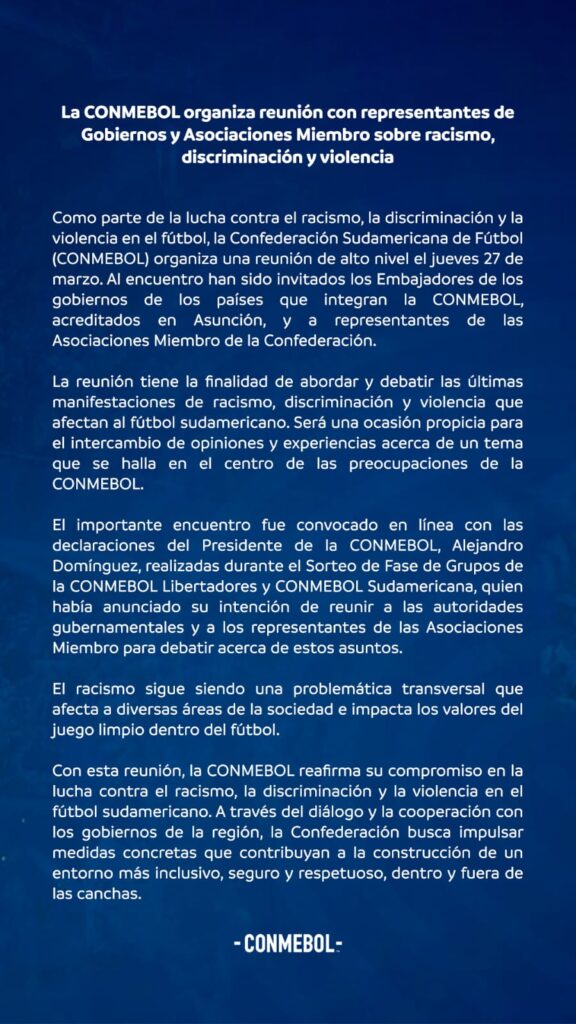 A Conmebol está convocando uma reunião com os dez representantes dos governos e federações filiadas à entidade para um debate sobre os temas racismo, discriminação e violência.