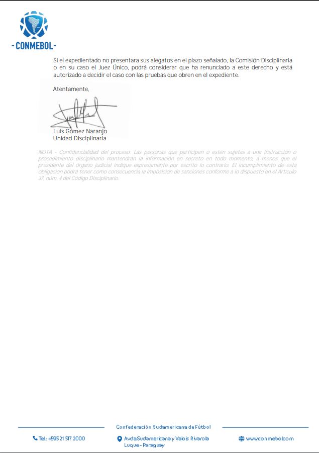 O clube tem o prazo até a próxima sexta-feira (23), às 13h, para enviar sua defesa. A multa pode chegar a US$ 100 mil (R$ 540 mil na cotação atual) pela Conmebol.