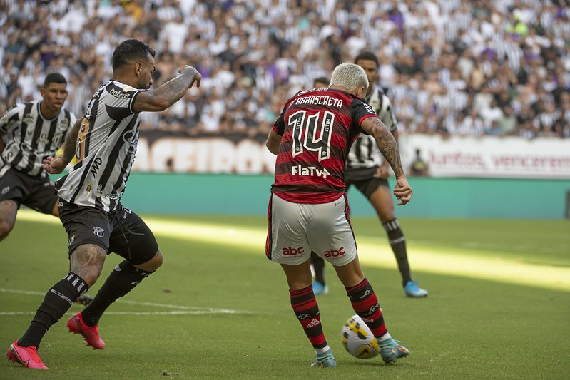 O Flamengo deixou escapar uma vitória que seria importantíssima para a equipe na sequência do Campeonato Brasileiro. O rubro-negro esteve muito próximo de vencer por 2 a 1, fora de casa, mas o time carioca não suportou a pressão cearense e cedeu o empate para o Ceará nos minutos finais, em um lance marcado por falha do goleiro Hugo Souza. Arão, de cabeça, marcou duas vezes para o Flamengo. Mendoza e Nino Paraíba, de falta, fizeram os gols do Ceará na tarde deste sábado pelo Castelão.