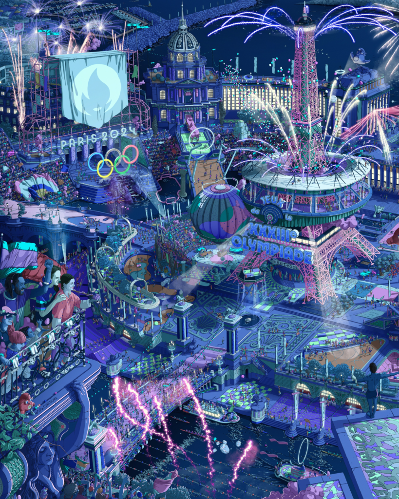 A versão original da arte levou cerca de 2.000 horas para ser finalizada. O cartaz é uma homenagem à cidade de Paris, retratando seus monumentos mais famosos, como a Torre Eiffel, o Arco do Triunfo e o rio Sena, onde ocorreu a cerimônia de abertura dos Jogos.