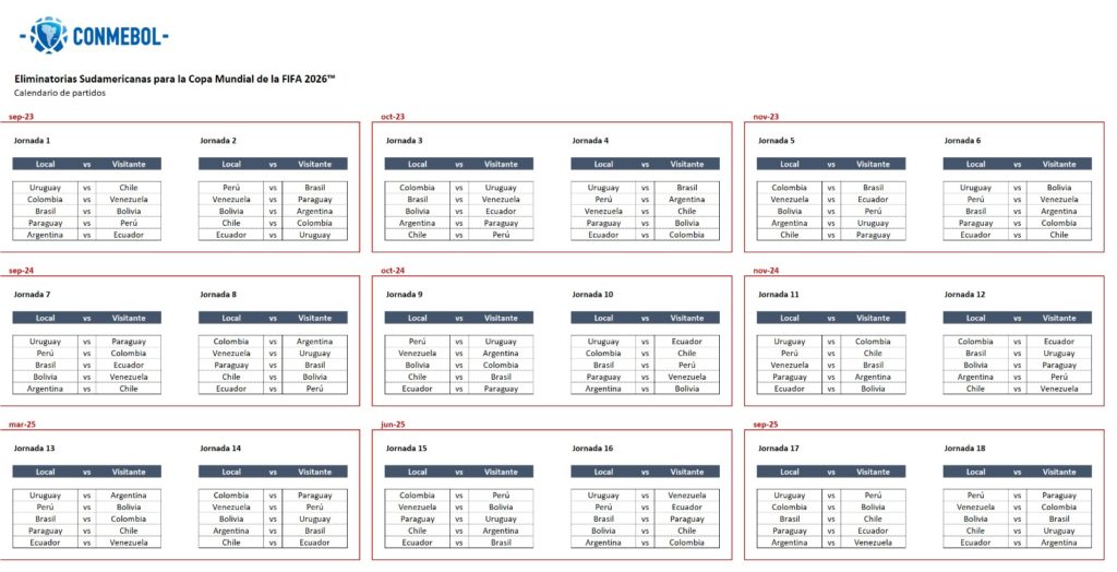 A FIFA divulgou hoje o Calendário das Eliminatórias da Copa do Mundo de 2026, com sedes nos Estados Unidos, México e Canadá, começando em 25 de maio e a grande final no dia 19 de julho. No Congresso da Entidade que está sendo realizado em Kigali, em Ruanda, foi informado à Conmebol a ordem dos jogos a partir de setembro deste ano.