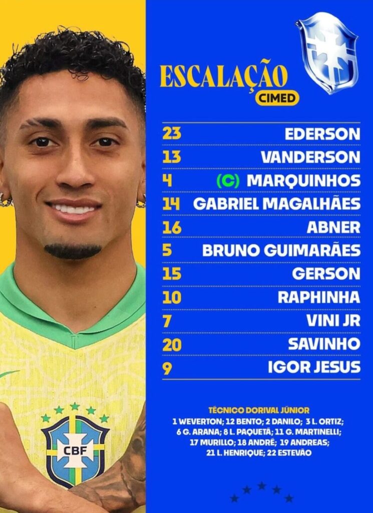 A grande novidade na equipe fica por conta da volta de Vinícius Júnior, que não esteve na última data Fifa, de outubro, fora por lesão na cervical. Assim, o atacante do Real Madrid inicia entre os 11 principais, justamente no lugar de Rodrygo. O meia recebeu a notícia de corte do grupo, assim como Éder Militão, por problema muscular em uma das coxas – o zagueiro rompeu o ligamento cruzado anterior do joelho direito.
