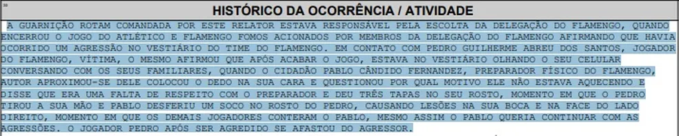 “Em contato com Pedro Guilherme Abreu dos Santos, jogador do Flamengo, vítima, o mesmo afirmou que após acabar o jogo estava no vestiário olhando o seu celular, conversando com os seus familiares, quando o cidadão Pablo Cândido Fernandez, preparador físico do Flamengo, autor, aproximou-se dele, colocou o dedo na sua cara e questionou por qual motivo ele não estava aquecendo. Disse que era uma falta de respeito com o preparador e deu três tapas no seu rosto, momento em que Pedro tirou a sua mão, e Pablo desferiu um soco no rosto de Pedro, causando lesões na sua boca e na face do lado direito. Momento em que os demais jogadores contiveram Pablo. Mesmo assim, Pablo queria continuar com as agressões.”
