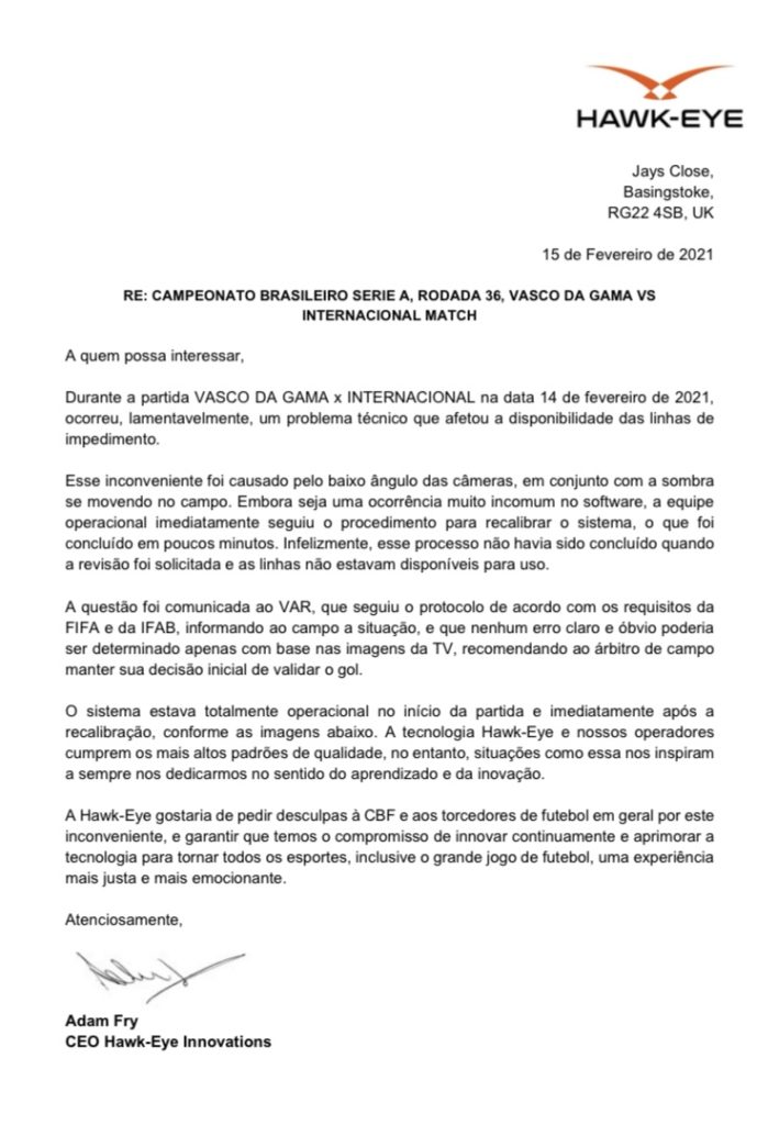 A CBF divulgou Nota Oficial nesta segunda-feira (15/2), com as explicações da empresa Hawk-Eye responsável pela tecnologia do VAR no campeonato brasileiro, confirmando problemas técnicos no equipamento em São Januário na tarde do último domingo para Vasco x Internacional e pede desculpas aos torcedores.